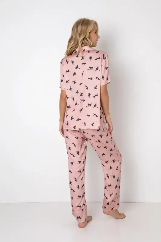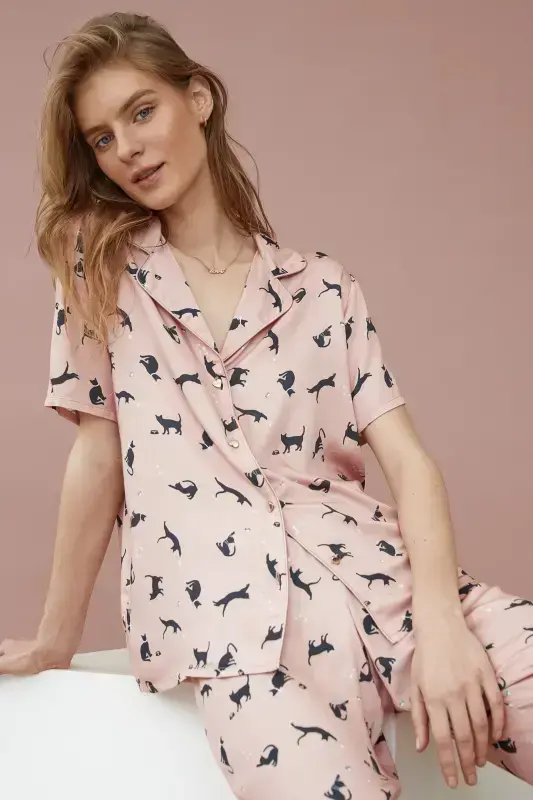 Προσθέστε λίγη διασκέδαση στην ώρα του ύπνου με αυτό το σετ πιτζάμες πλούσιο σε βισκόζη που διαθέτει ένα παιχνιδιάρικο στάμπα με γάτες. Ένα σετ πιτζάμα κλασικού σχήματος είναι κατασκευασμένο από μια εξαιρετικά απαλή γυαλιστερή βισκόζη, με μοτίβο γάτας. Ένα κοντομάνικο τοπ με κουμπιά είναι διακοσμημένο με ροζ σωλήνες στον γιακά και κομψά χρυσά κουμπιά καρδιάς. Το παντελόνι πιτζάμα είναι διακοσμημένο με σατέν σωλήνες στο κάτω μέρος και έχει λάστιχο στη μέση.